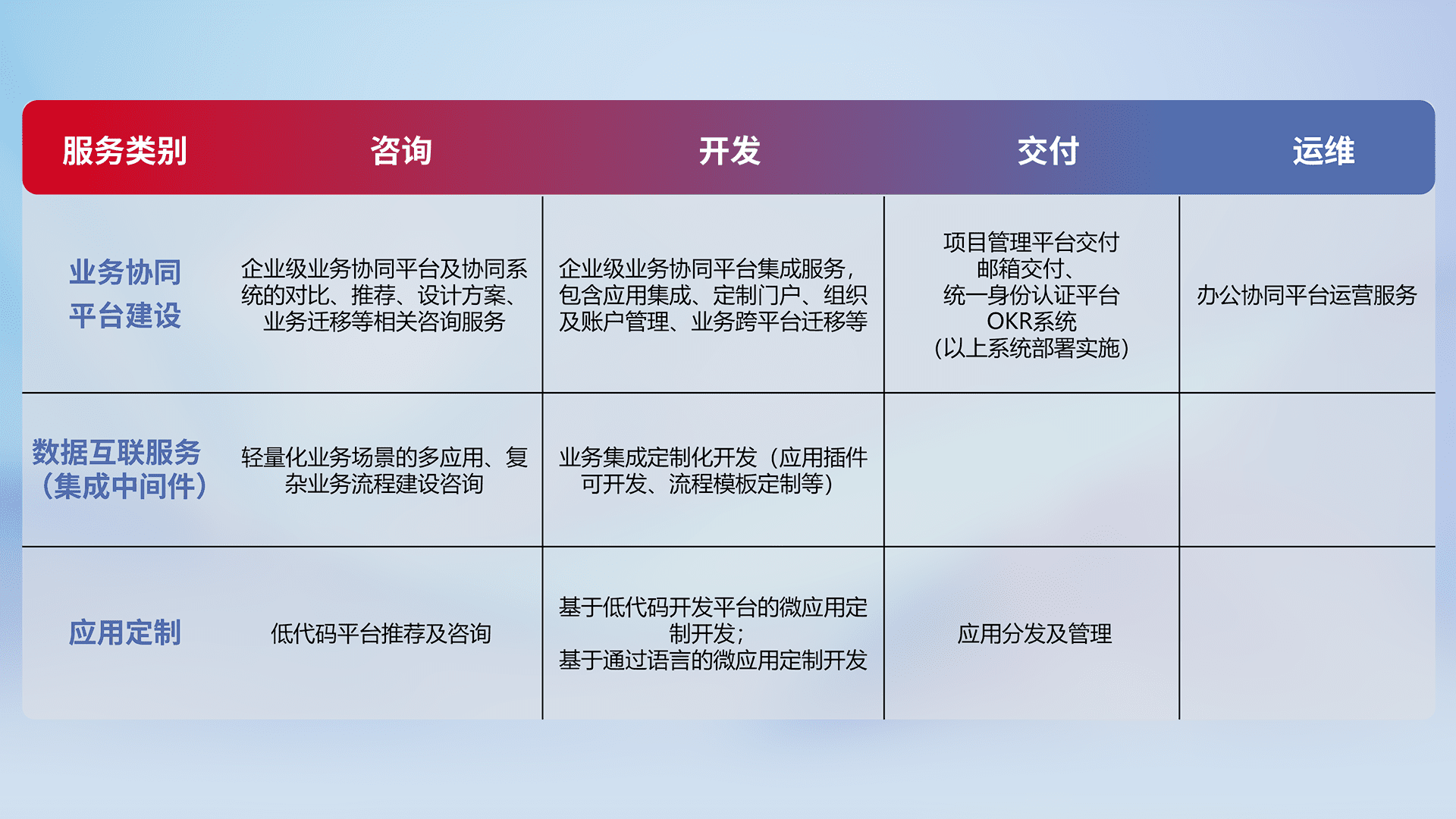 针对钉钉、、、、企微、、IDaas等平台级产品提供产品的规划、、方案、、、交付、、、、定制化开发等服务,,实现如统一协同办公、、、智能客户服务、、混合会议管理、、智能数据查询、、、、等业务场景,,,,实现数字化转型。。。。