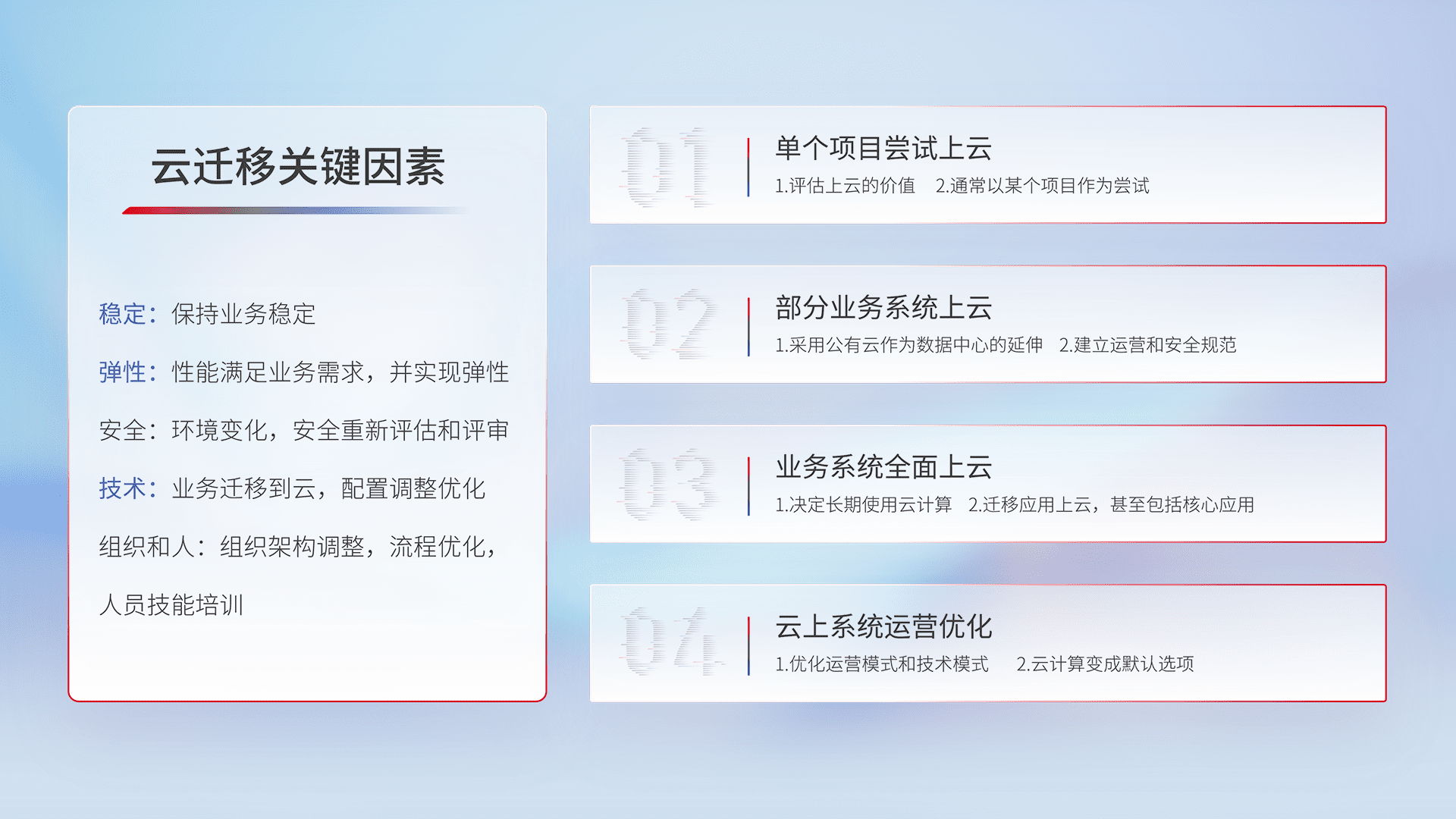 结合实际业务,,,从规划设计、、、、云平台选型、、、、云原生改造、、、数据迁移、、、、集成交付,,迁移全过程为客户识别最佳上云路径,,,做好风险识别管理,,,设计网络架构、、、身份权限、、、安全审计合规、、、、操作审计、、、日志审计、、监控告警策略、、、、多站点容灾设计等,,,,对云上基础设施进行整体规划,,,提升IT治理水平,,,以满足弹性、、、高可用、、高性能的需求。。。