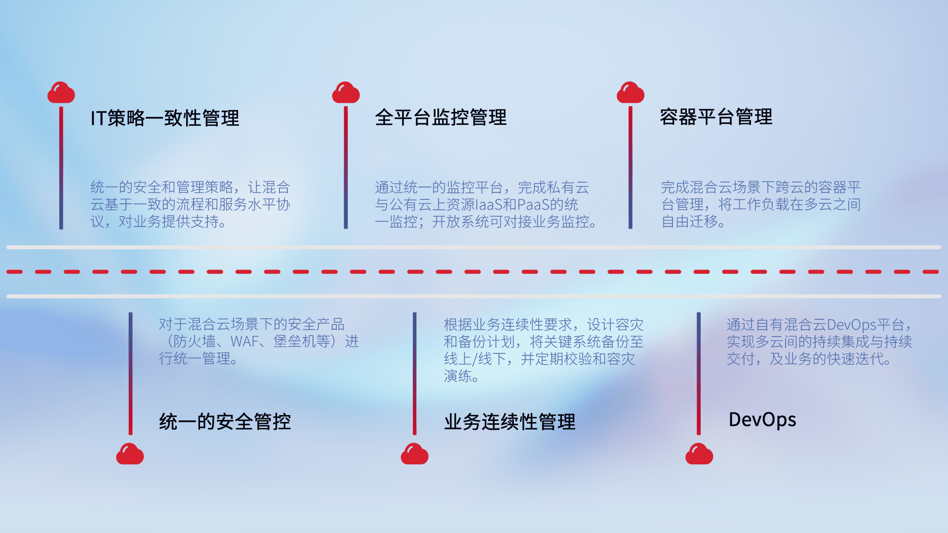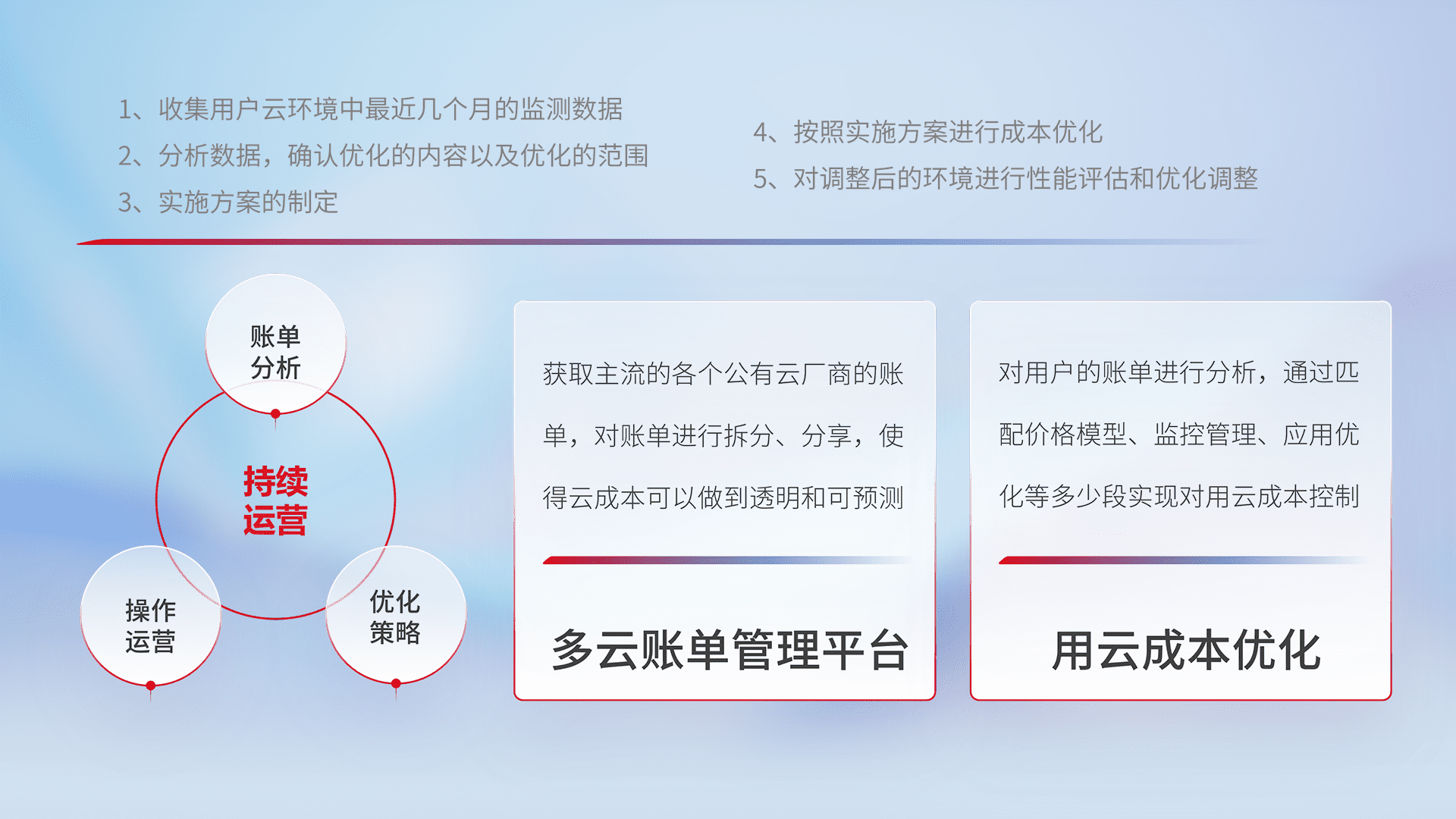 通过多云纳管,,以统一的资源数据模型把客户的云资源进行抽象和封装,,,,进而实现对多云资源的统一操作,,,,保障云资源管理的可靠性、、、稳定性与可用性。。。量身定制化运维内容,,,配置、、开发运维、、、、补丁管理、、、、备份、、监控、、、、认证和访问管理、、、审计和日常巡检等,,,保障在用云过程中的可靠度,,,,稳定度以及高可用率。。。。