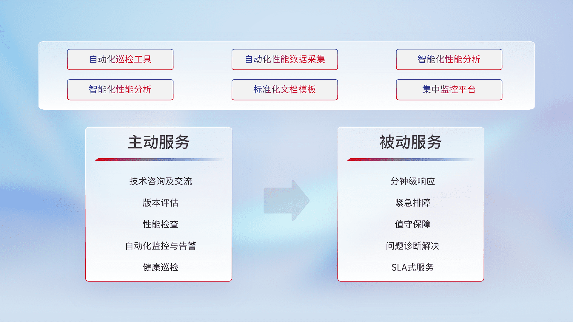 智能化工具和标准化文档,,保障服务质量,,,,提供主动服务(包含技术咨询、、、版本评估、、性能检查、、、、自动化监控与告警、、健康巡检)和被动服务包含(分钟级响应、、、、紧急排障、、、值守保障、、、、问题诊断解决、、SLA服务)。。。。